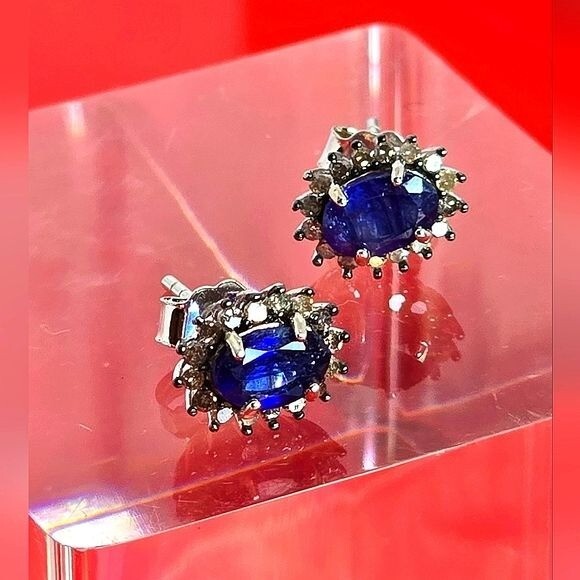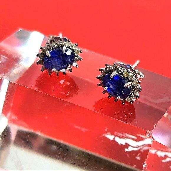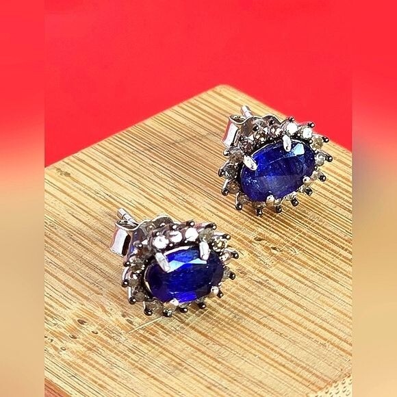 925 Sterling Silver Stud Earrings with Natural Blue Sapphire & Natural Diamonds