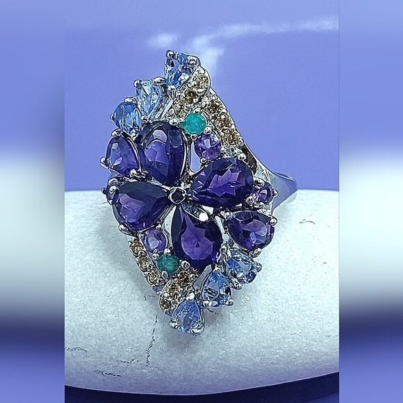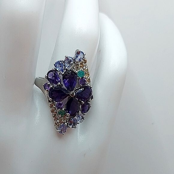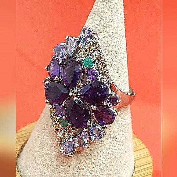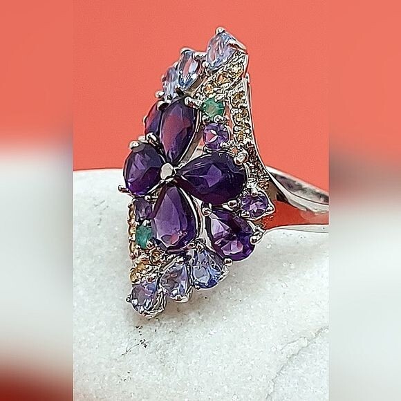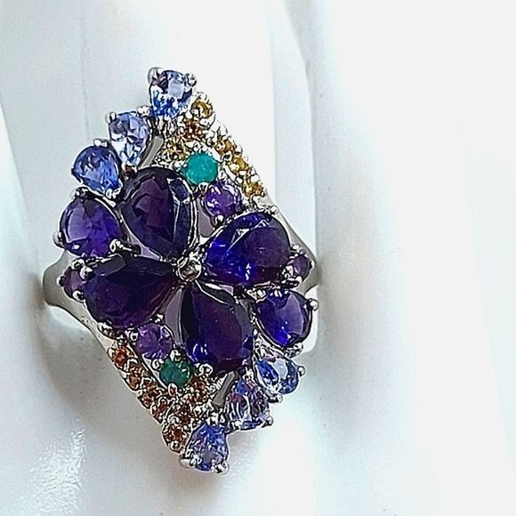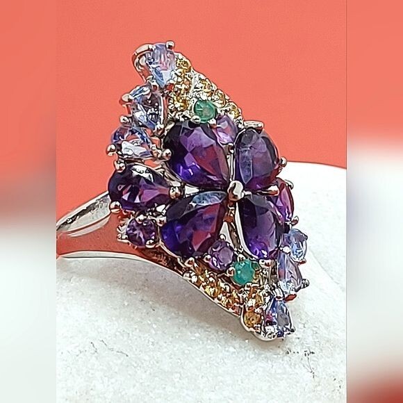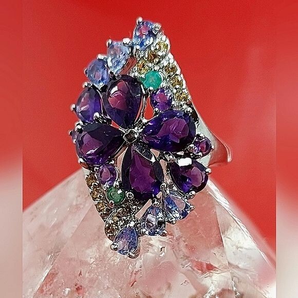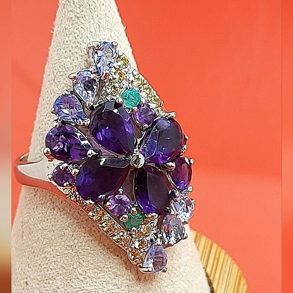 Unheated Pear Amethyst 7x5mm Emerald Sapphire Tanzanite 925 Sterling Silver Ring Sz 7.5
