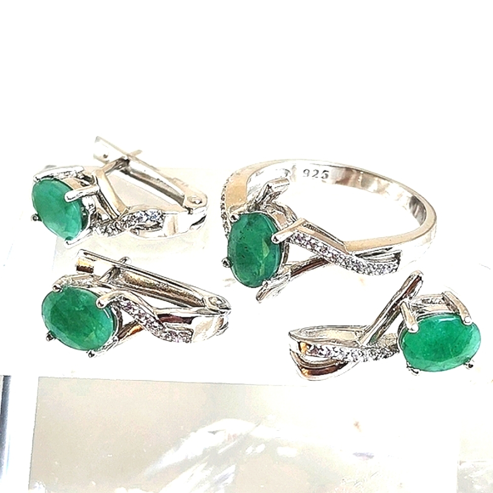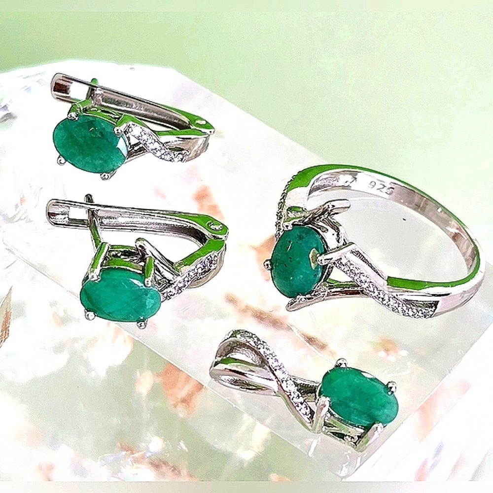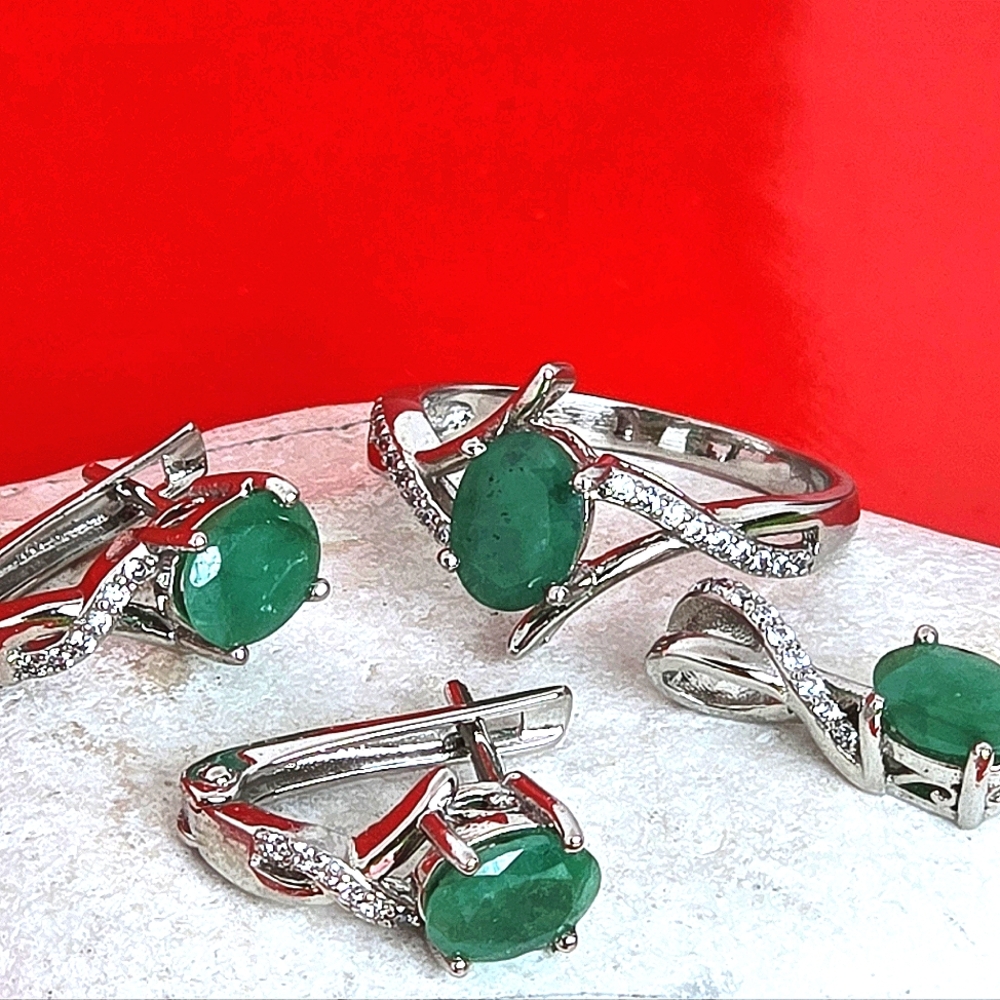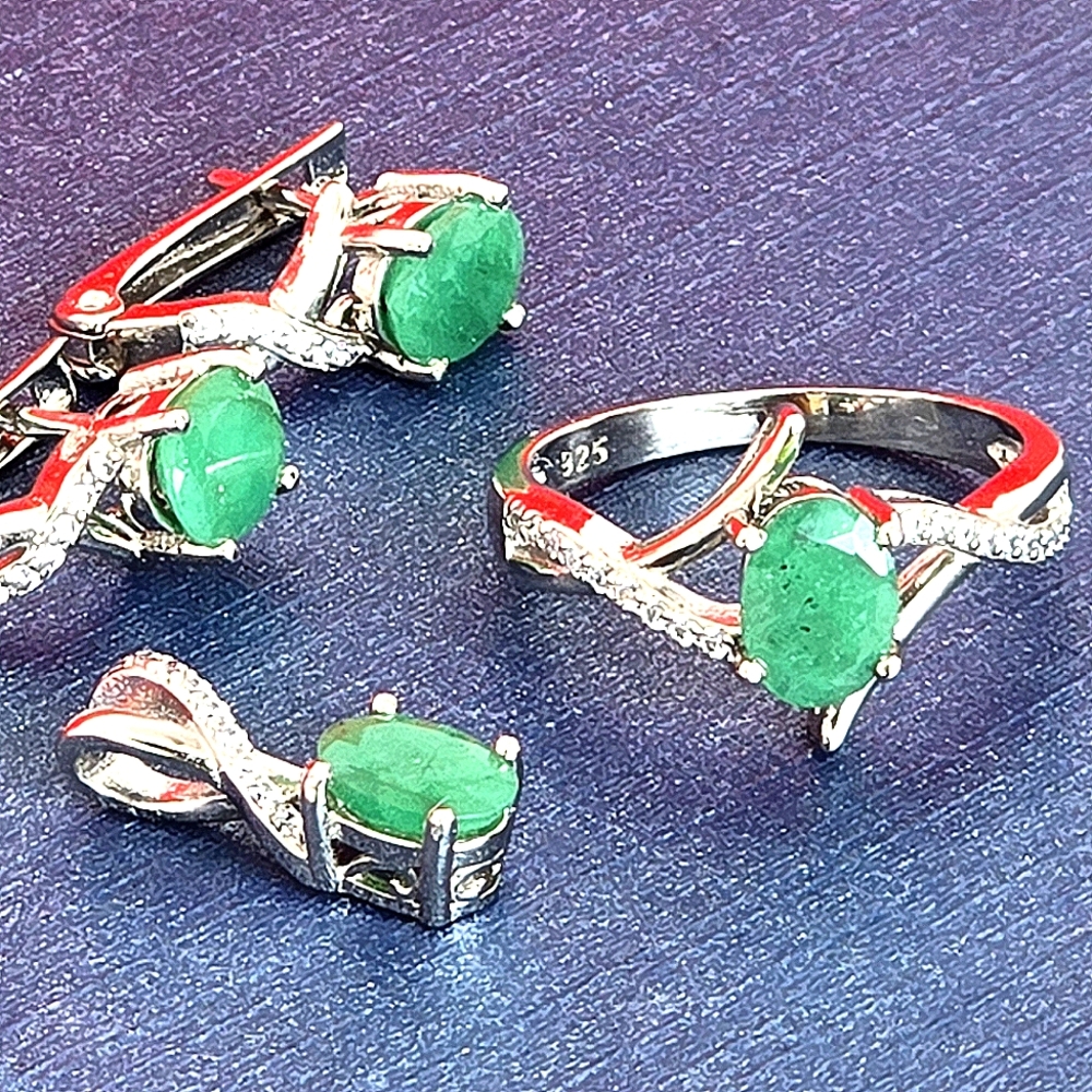Natural Emerald & CZ 925 Sterling Silver Set: Ring, Earrings, Pendant