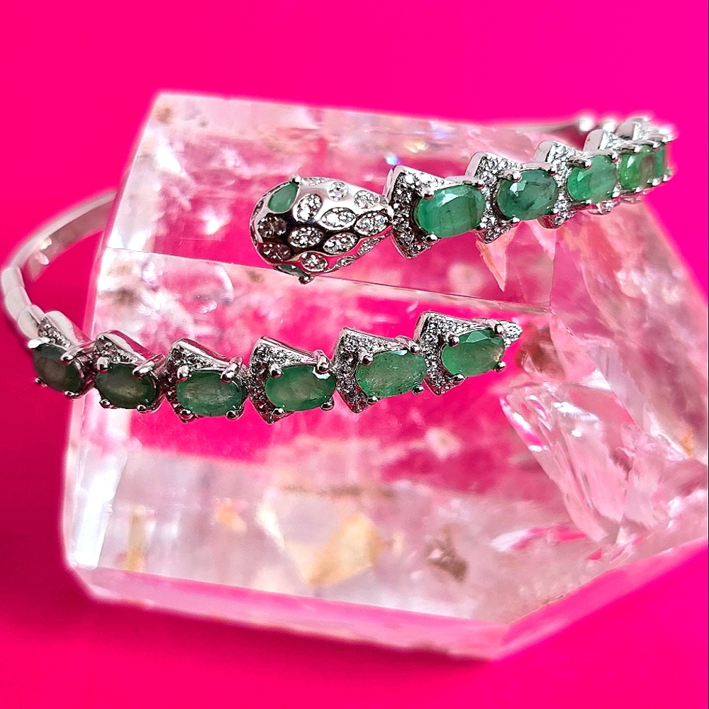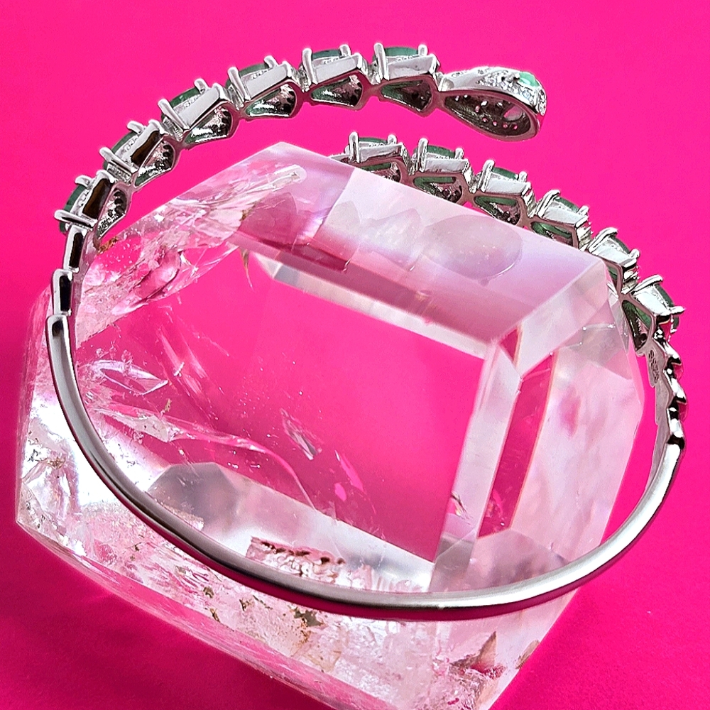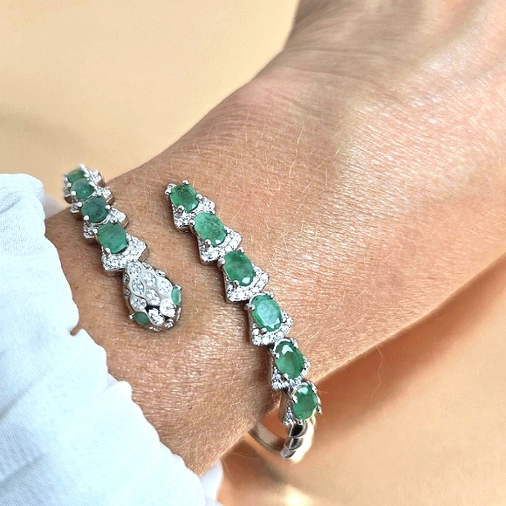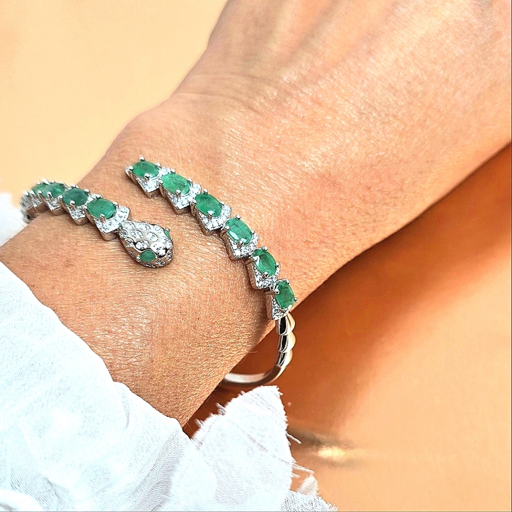 Natural Emerald & CZ 925 Sterling Silver Snake Bangle Bracelet