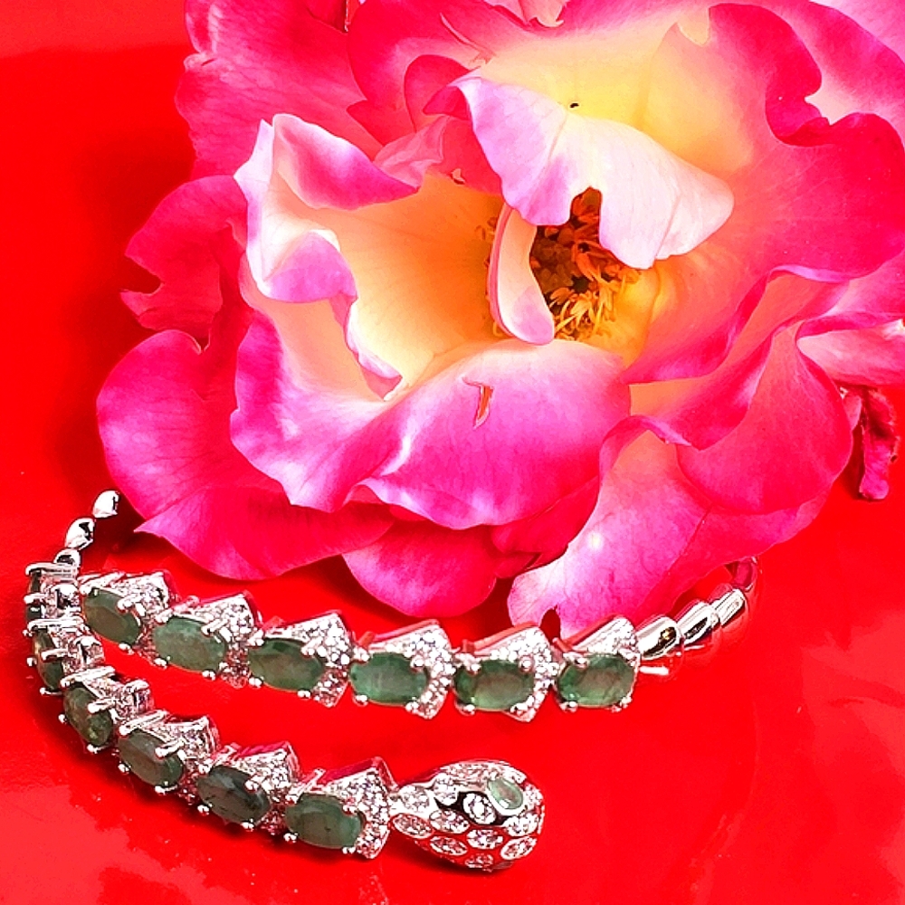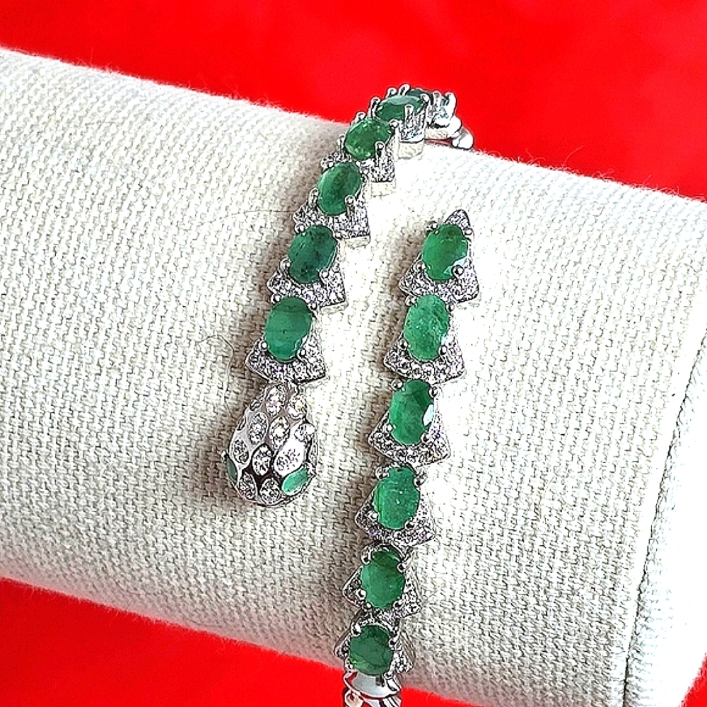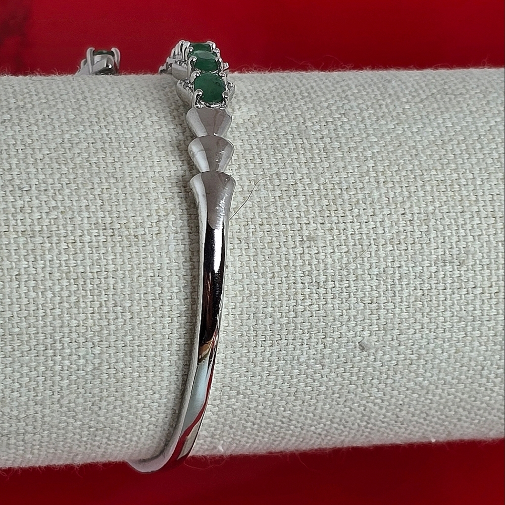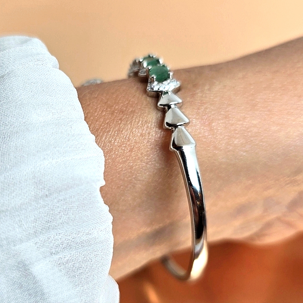 Natural Emerald & CZ 925 Sterling Silver Snake Bangle Bracelet