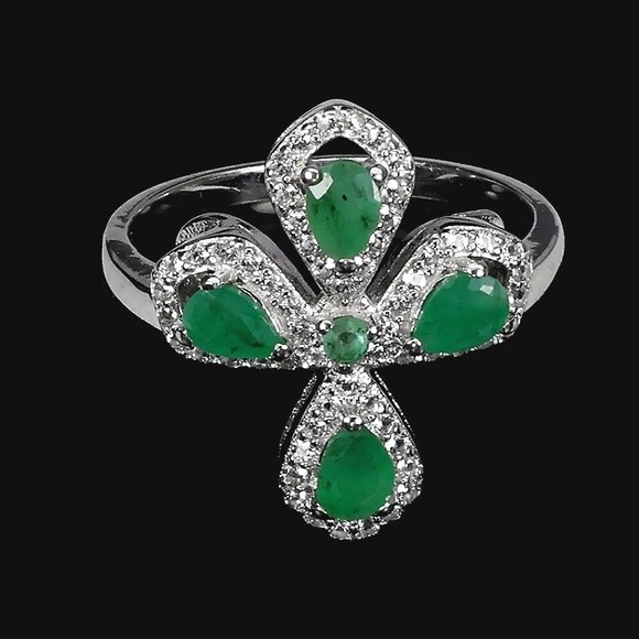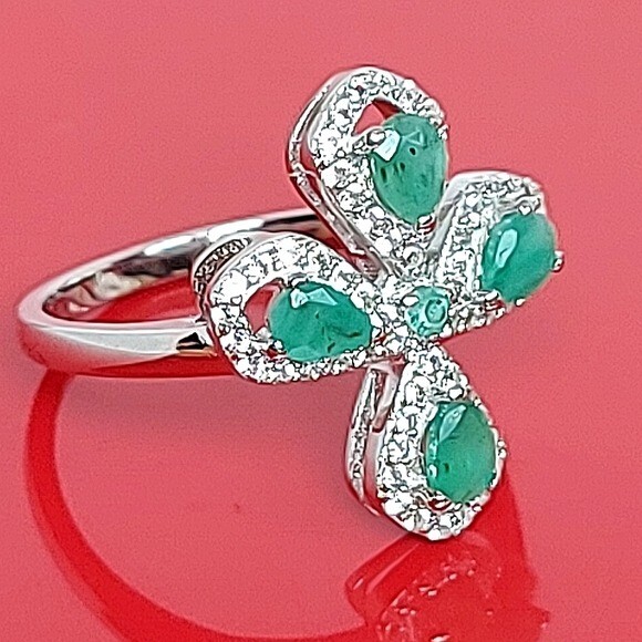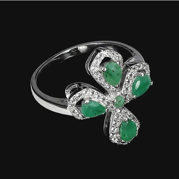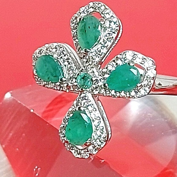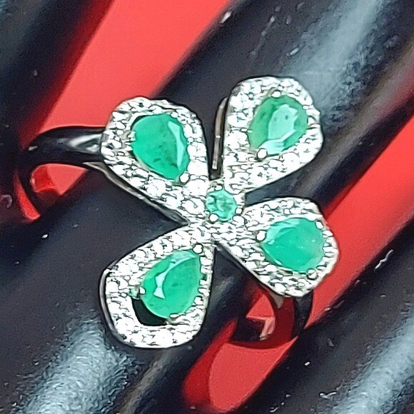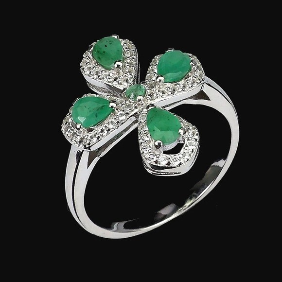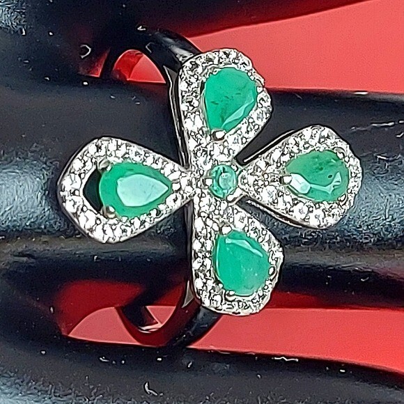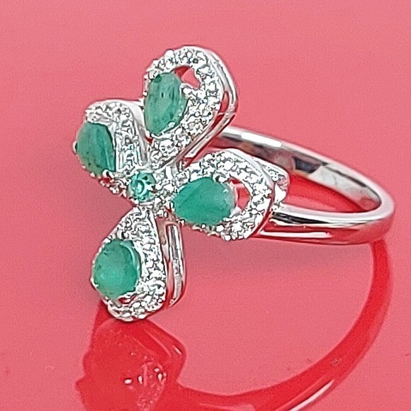 Natural Green Emerald 4x3mm & White Topaz 925 Sterling Silver Ring Size 7.75 (Brand new without tags)