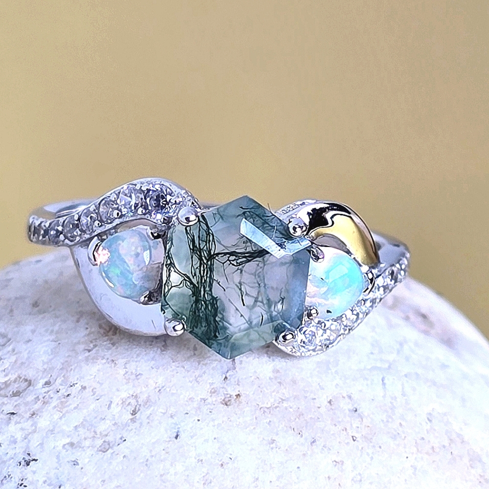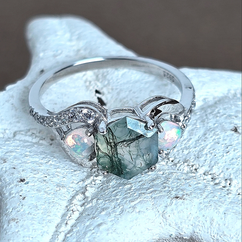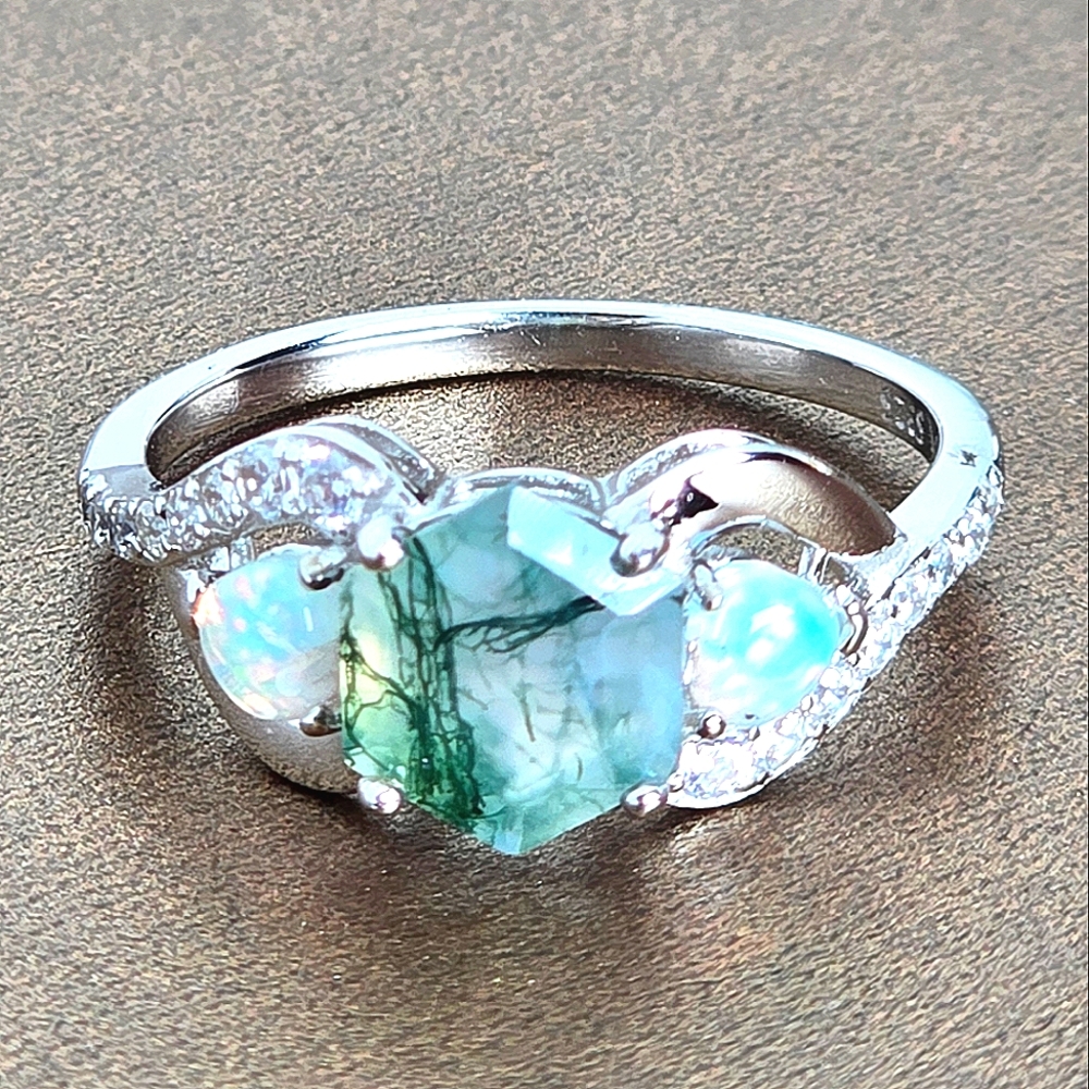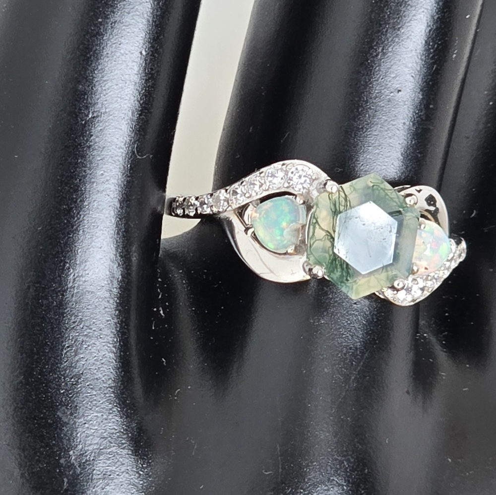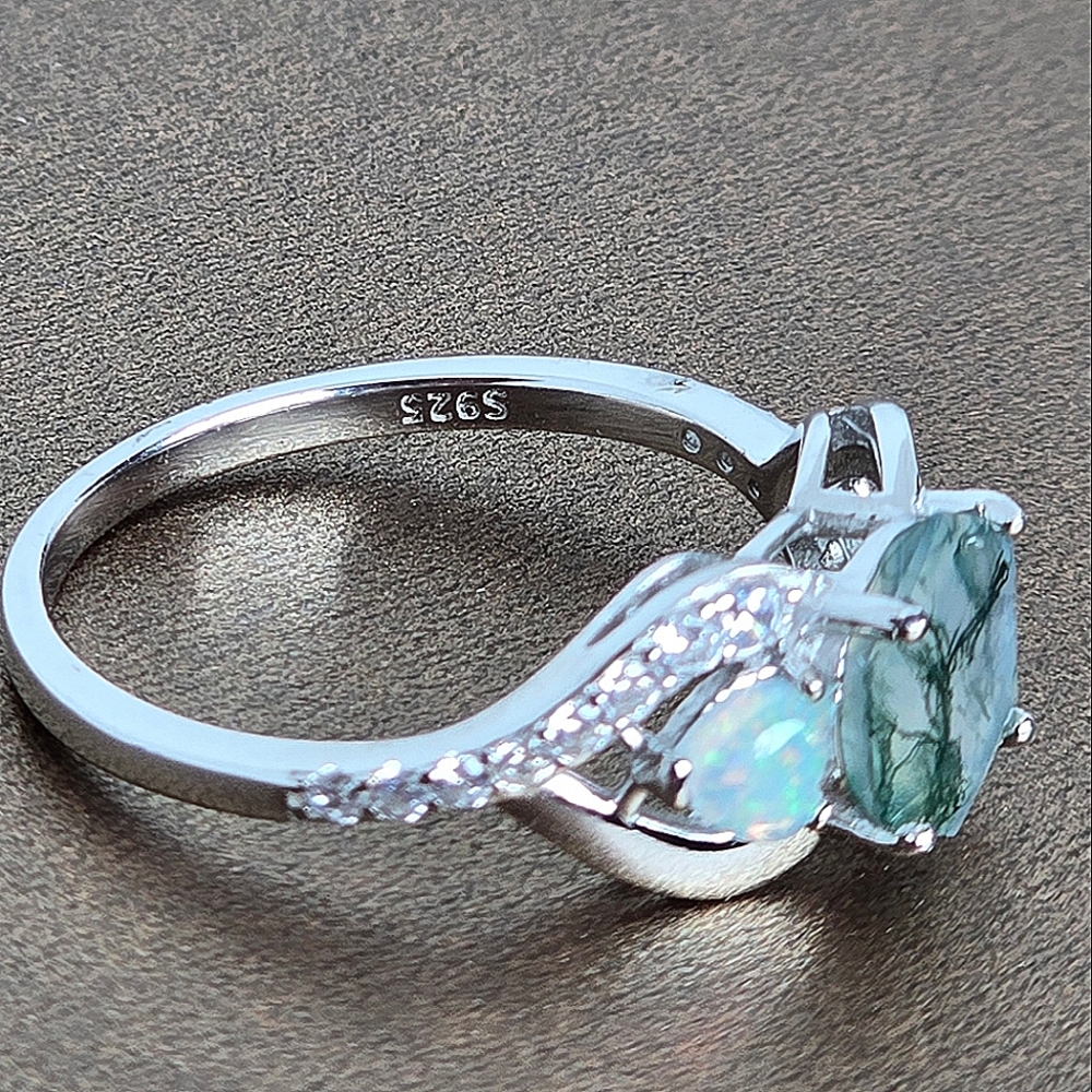 Natural Moss Agate & Opal 925 Sterling Silver Ring Sz 9.25