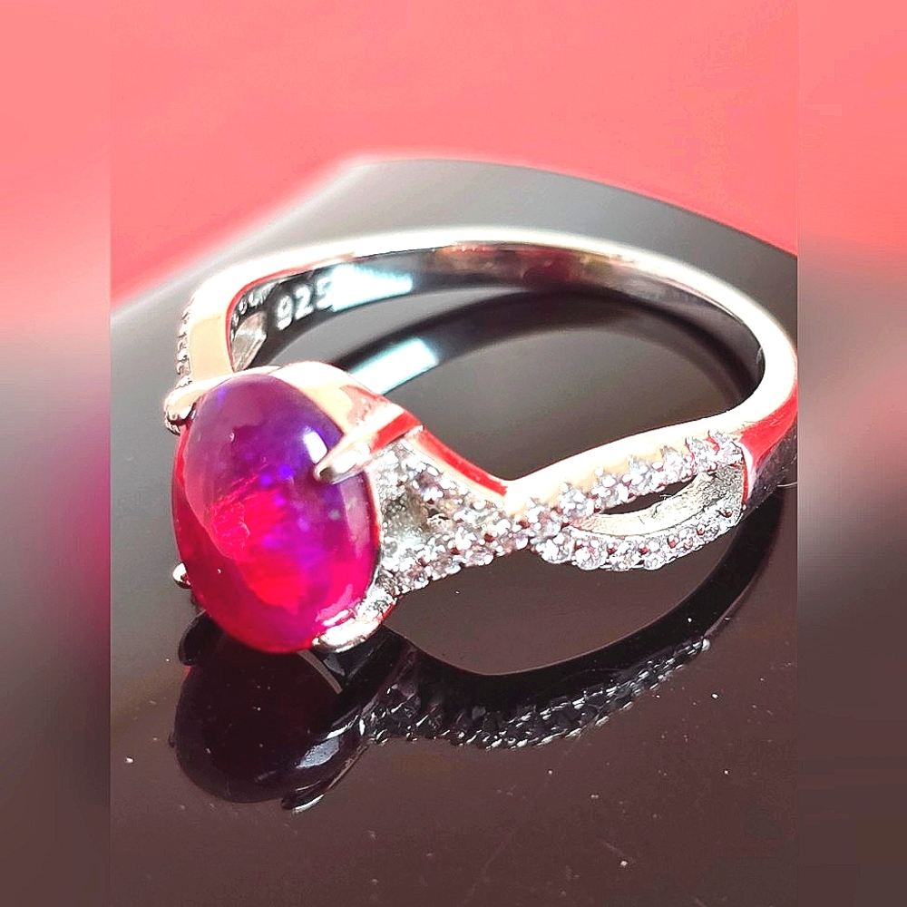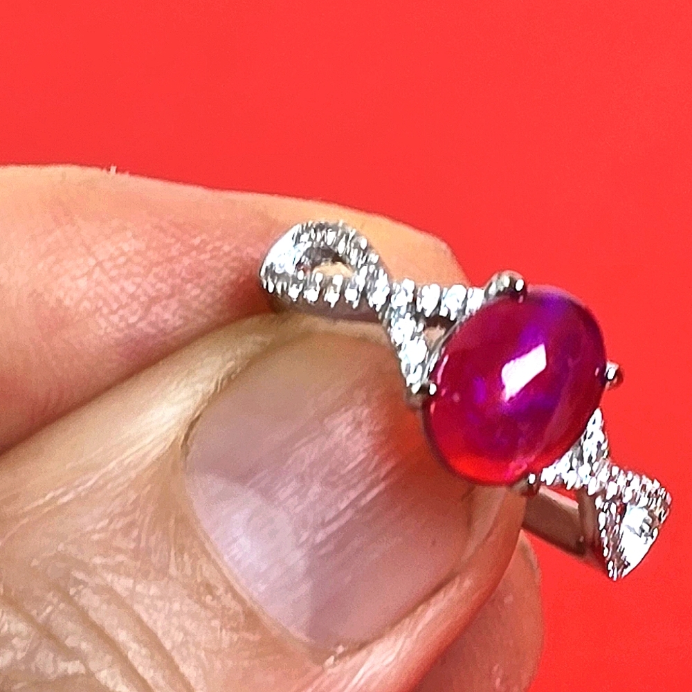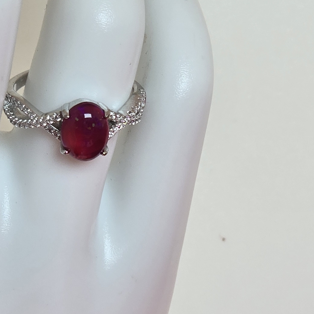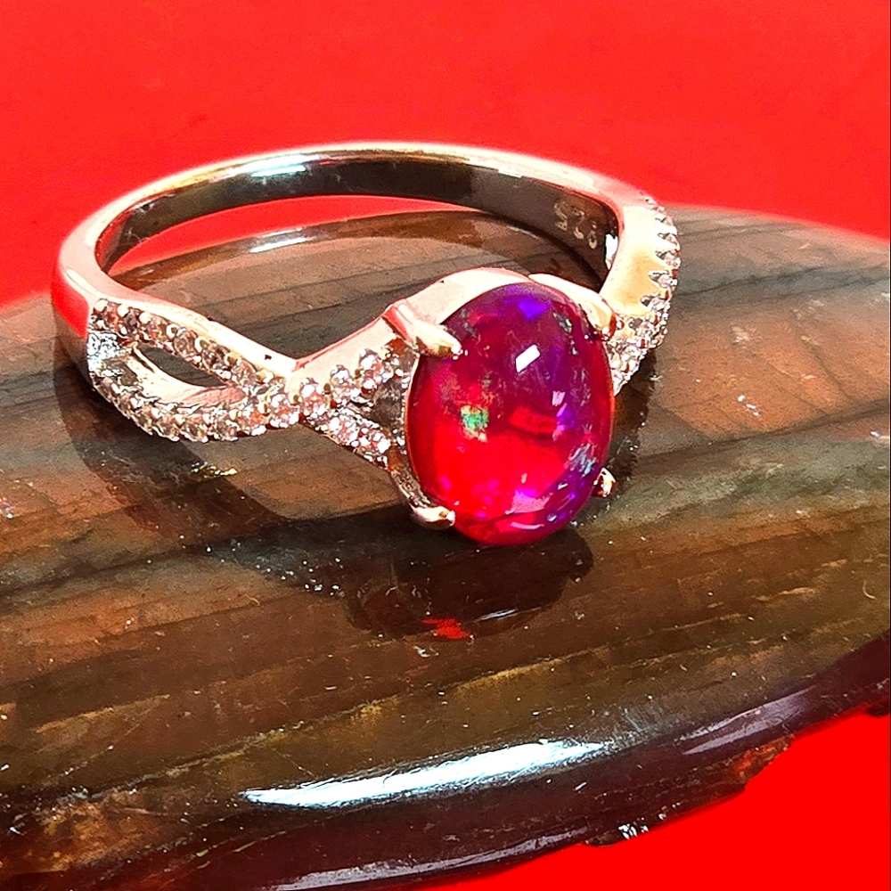 Natural Red Opal & CZ 925 Sterling Silver Ring