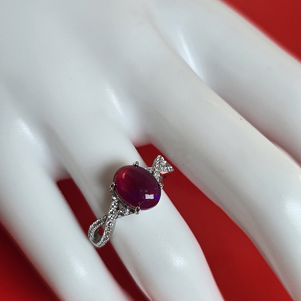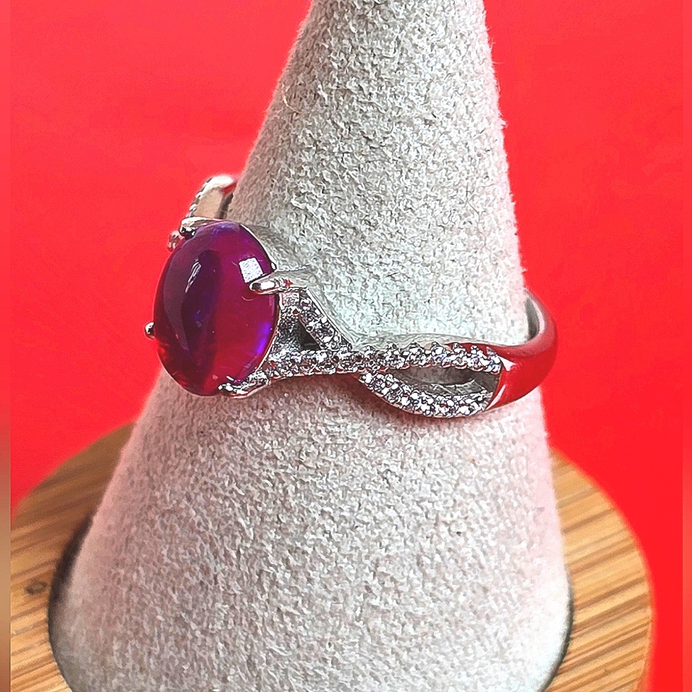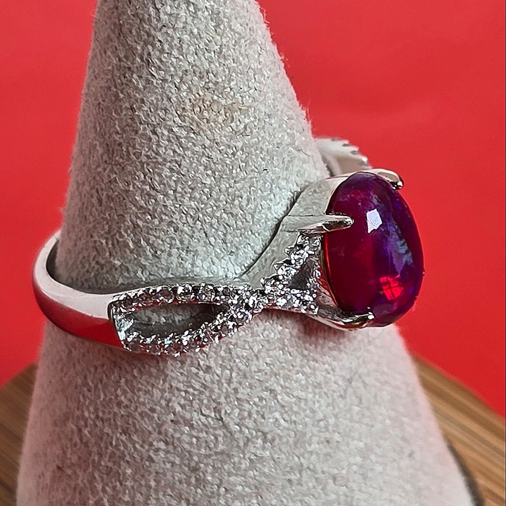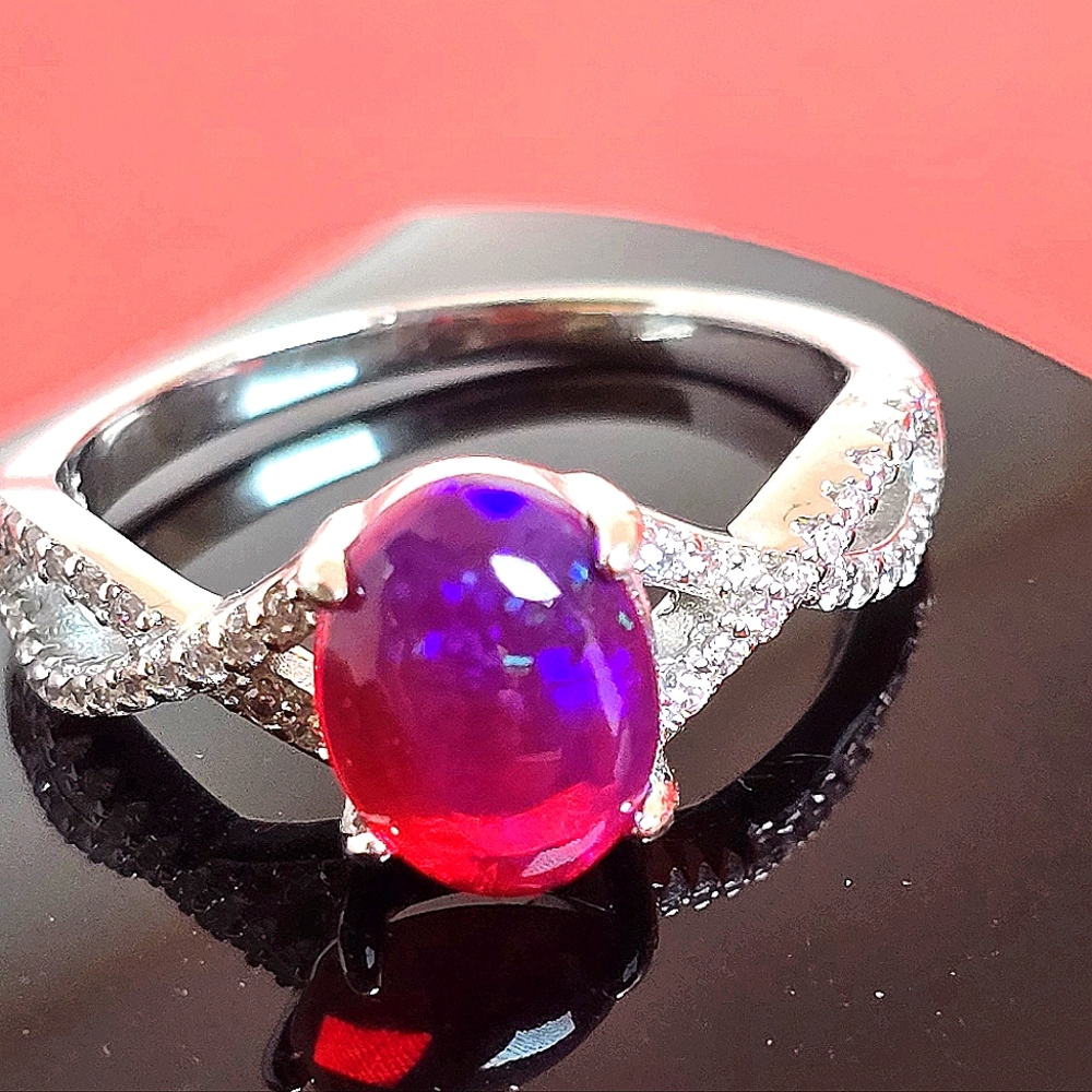 Natural Red Opal & CZ 925 Sterling Silver Ring